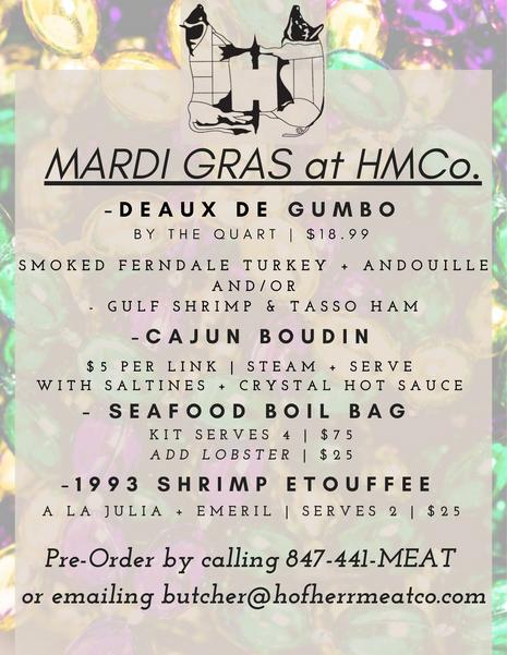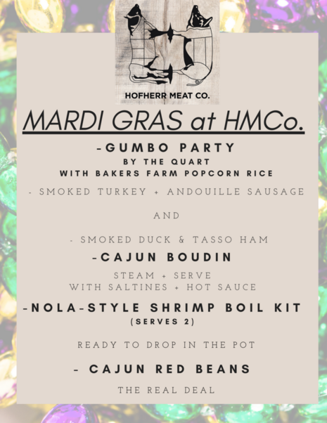 The Guardians of the Grub are excited to share what we’ve been cooking up for this year’s Mardi Gras. Along with the Southern staples available at the butcher shop, we will be offering a full spread for you to enjoy with friends and family!